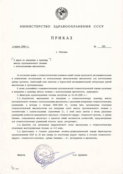И только в 1986 году, когда уже просто нельзя было закрывать глаза на успешность этого метода за рубежом, наш Минздрав СССР издал приказ №310 от 4.03.1986 г. разрешающий дентальную имплантацию в СССР.