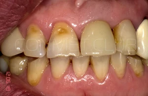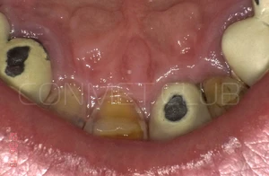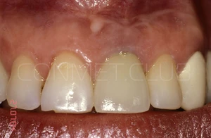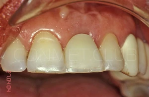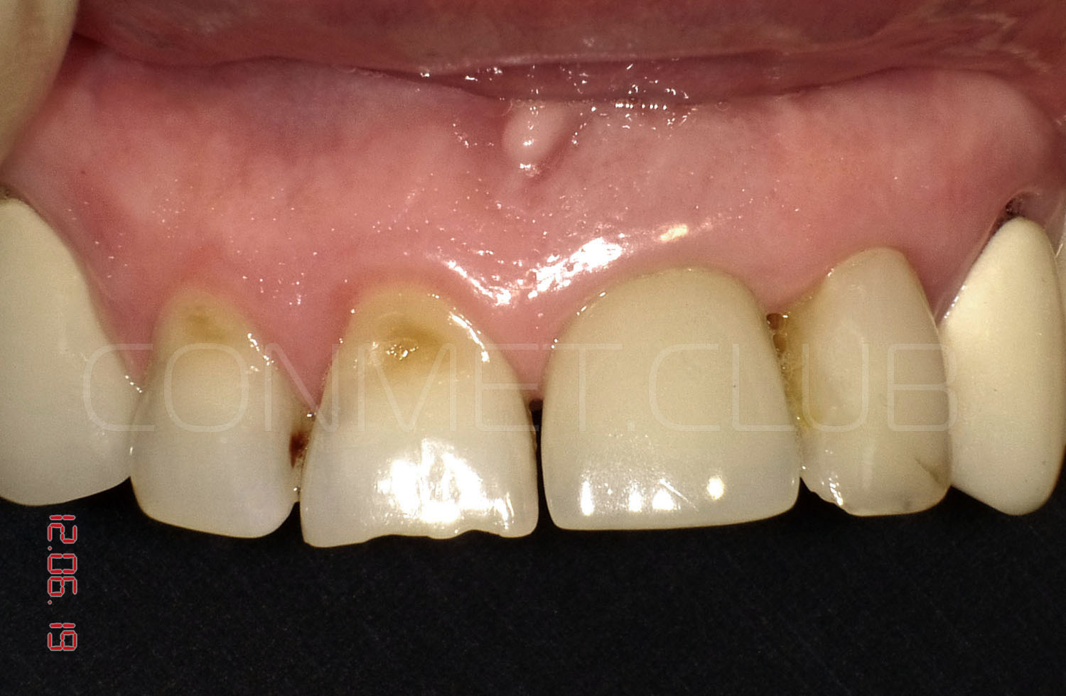 немедленная имплантация с использованием имплантата КОНМЕТ (полированная трансгингивальная часть, пескоструйная обработка эндооссальной части) с неполной облитерацией лунки удаленного зуба; интерфейс имплантата-только конус Морзе без антиратационных элементов внутри; глубокое резцовое перекрытие. Результат: 15 лет функционирования без единой проблемы с имплантатом и коронкой (ни малейшей ротации и ни единой расцементировки), идеальное, для такой ситуации сохранение межзубных сосочков.