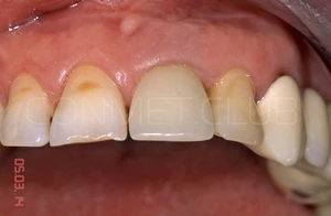По причине крайне малой высоты абатмента, палатинальную поверхность коронки оставили не покрытой керамикой. Толщина металлического колпачка в этом месте 0,3 мм.