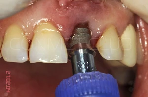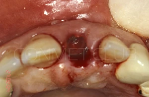 Сразу после экстракции зуба 21 производится установка имплантата КОНМЕТ с полированной трансгингивальной частью высотой более 3 мм. Интерфейс имплантата - просто конус Морзе и ни каких антиротационных шестигранников!
