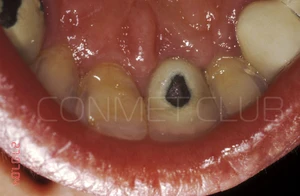 Через 3 месяца временная коронка удалена и начато изготовление стандартной металлокерамической коронки. Вид на имплантат КОНМЕТ сразу после удаления временной коронки.