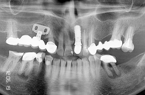 Контрольная рентгенограмм через 15 лет после операции. Если на рентгенограмме и можно различить небольшую щель между имплантатом и костью на уровне полированной части имплантата, то клинически она полностью отсутствует и не диагносцируется парадонтологическим зондом.