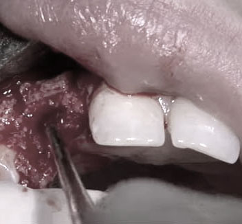 Фрагмент операции по увеличению ширины альвеолярного отростка верхней челюсти при помощи пьезохирургического аппарата (Bone splitting). В качестве восполняющего материала применяется Коллапан.